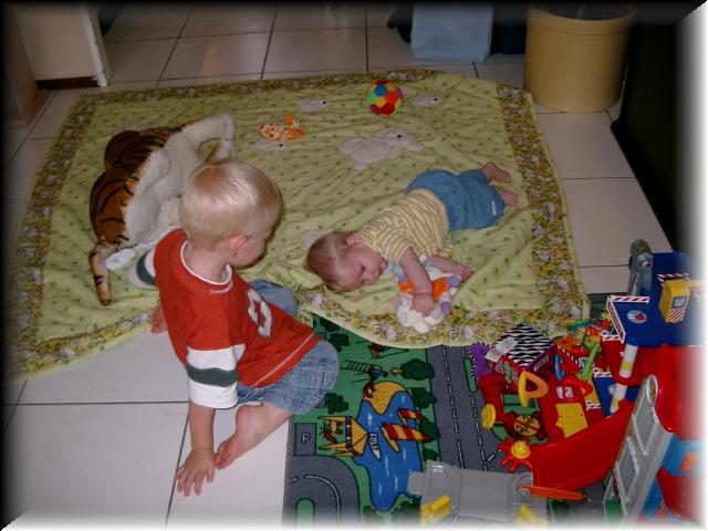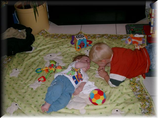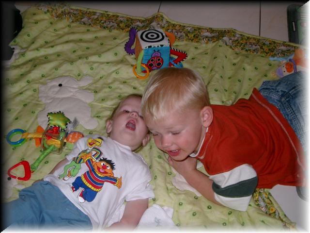 Ook Jordy kan steeds leuker met Danny samen spelen. Op het kleed op de grond of als Danny in het wipstoeltje zit. In het wipstoeltje zitten gaat ook steeds beter en Danny vindt het ook erg leuk want dan kan hij veel meer zien. Gewoon lekker om zich heen kijken of naar tijgertje, de poes, of het aquarium. Jordy is erg lief voor Danny en knuffelt hem de hele dag door. Al zijn speelgoed moet Danny zien en het liefst ook mee spelen en als Jordy weer een poep op de wc gemaakt heeft (hij is namelijk hard zijn best aan het doen om goed zindelijk te worden) dan komt hij dat dolenthousiast aan Danny vertellen.