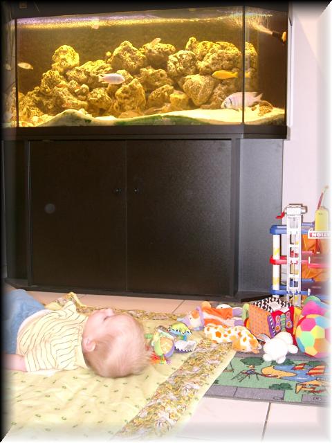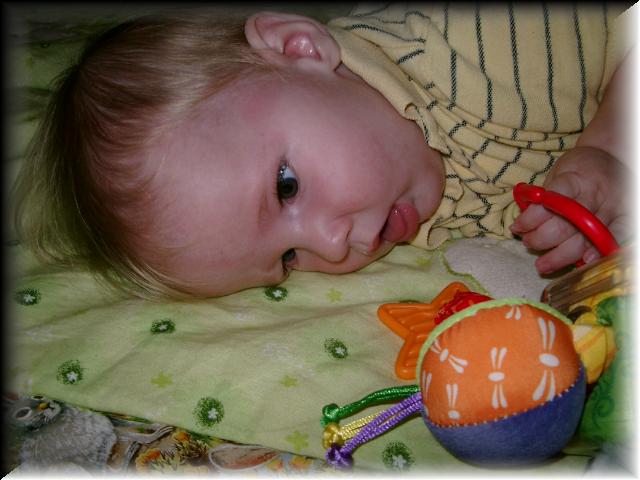 Hij is nu al redelijk in staat zijn hoofd korte tijd omhoog te houden. In de box speelt Danny ook graag met al zijn speeltjes en al spelenderwijs leert hij heel veel.