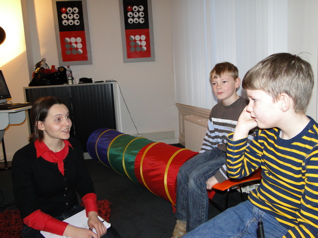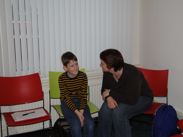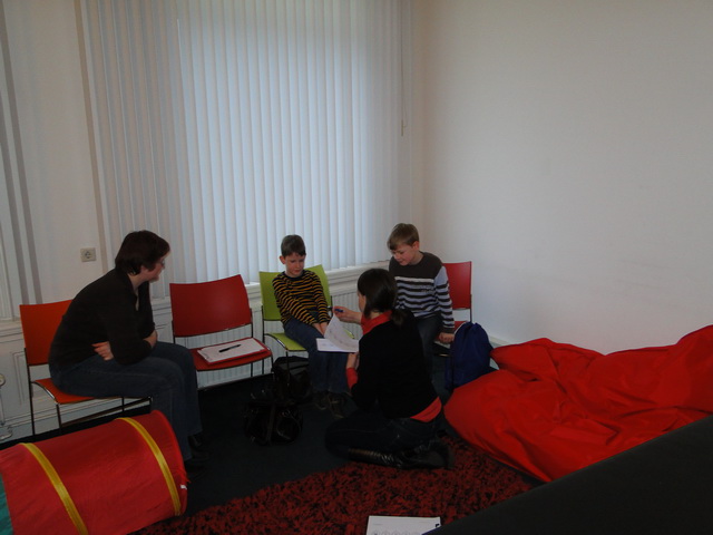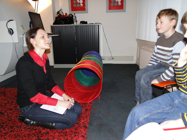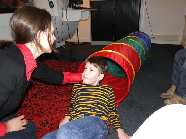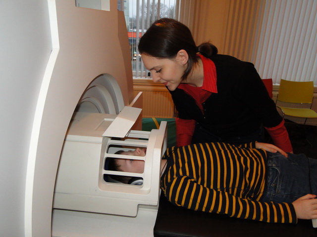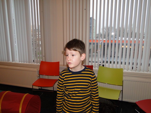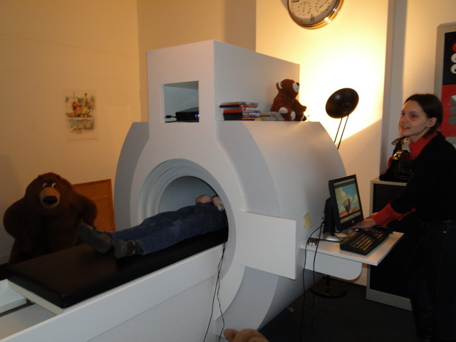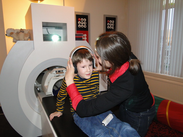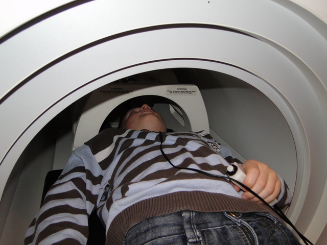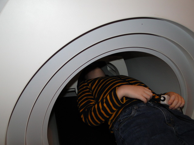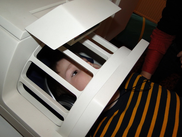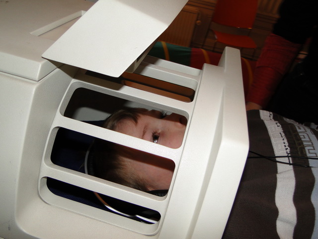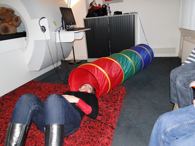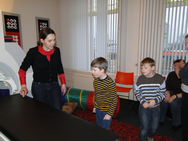 Eerst gaan we oefenen in de oefen MRI. De oefenMRI was is een gebouw tegenover het ziekenhuis waar ook de onderzoekers van kind en groei zitten. Daar wordt alles uitgelegd en horen de jongens wat voor een herrie het is in de MRI