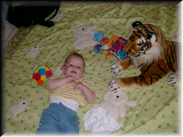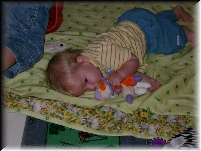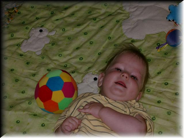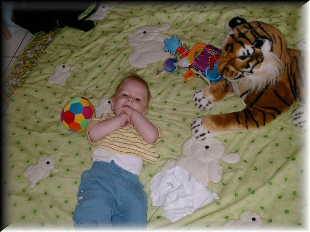 Hij is nu al redelijk in staat zijn hoofd korte tijd omhoog te houden. In de box speelt Danny ook graag met al zijn speeltjes en al spelenderwijs leert hij heel veel.