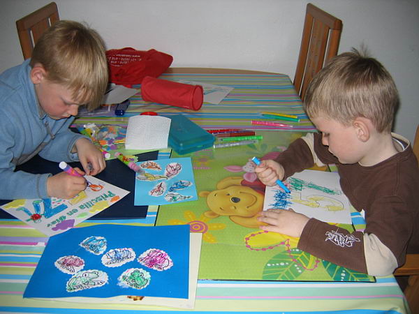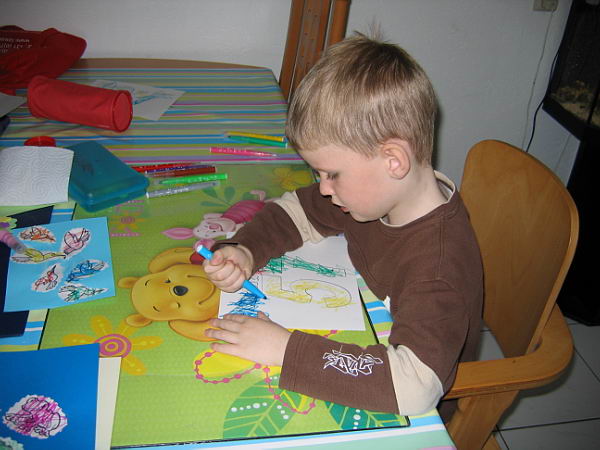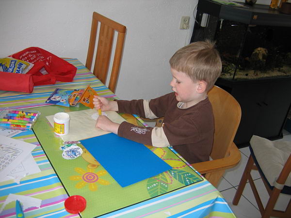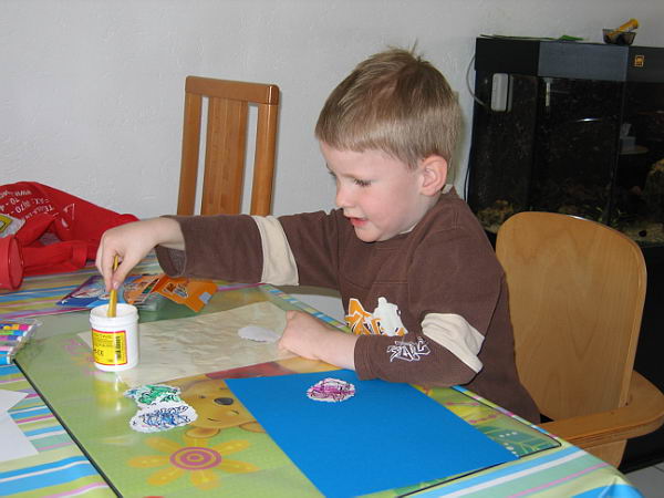 Toen Robin een week later weer in de klas kwam gingen de kinderen weer plakken. Nu kon Danny laten zien dat hij goed geleerd had hoe het wel moest. Hij volgde netjes de volgorde. Hij legde zijn papiertjes op de plastic onderlegger, smeerde de lijm erop en plakte zijn papiertjes netjes op het grote vel papier.