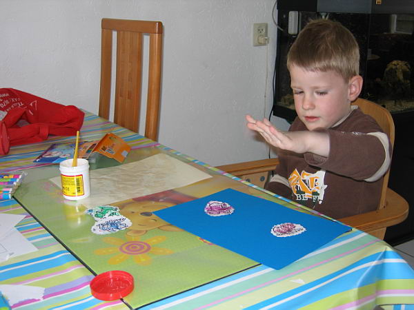 De eerste keer maakte Danny hier een rommeltje van. Hij begreep niet wat de volgorde was en deed maar wat. Waarschijnlijk komt dat ook doordat hij gewend is om veel lijm op een vel papier te smeren en daarna losse papiertjes daar op te leggen. Nu wordt het omgedraaid.
