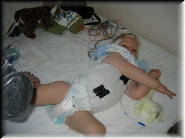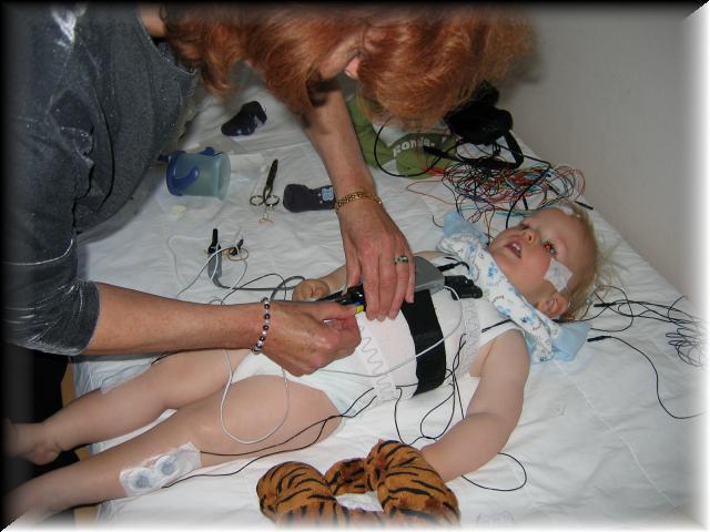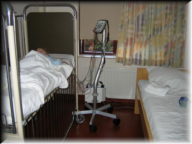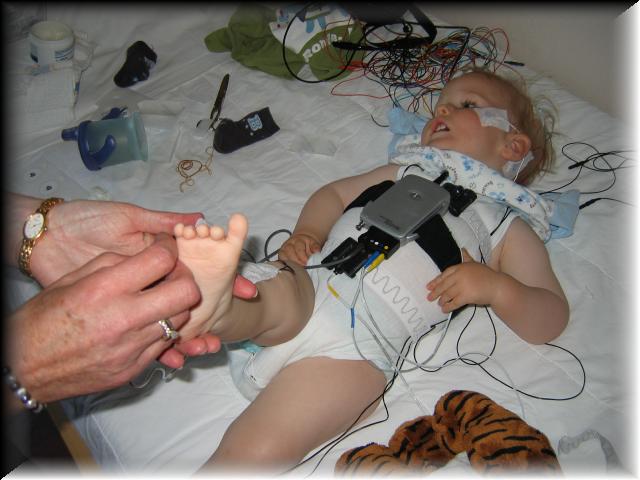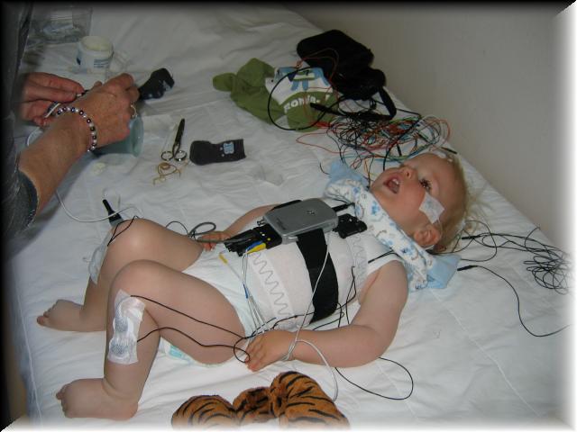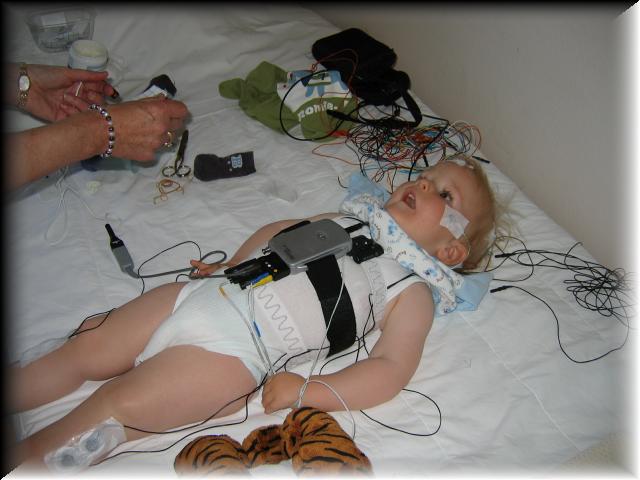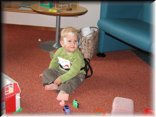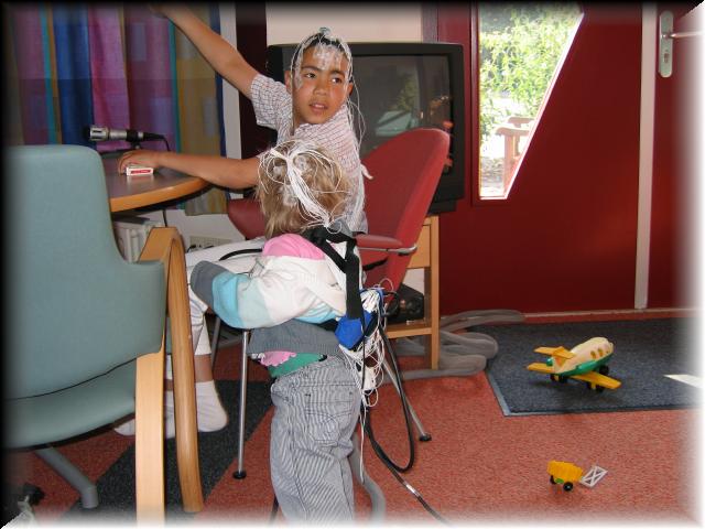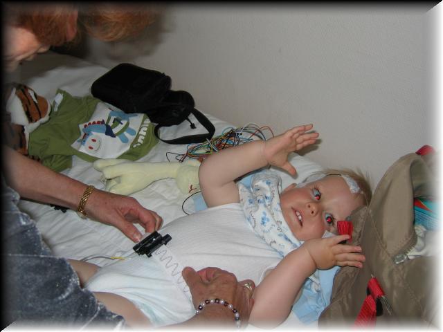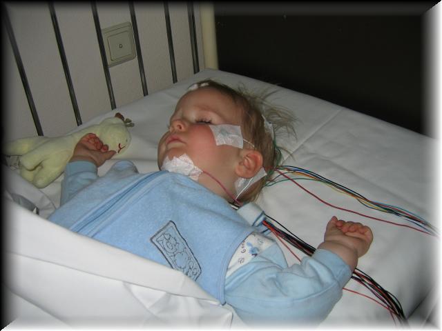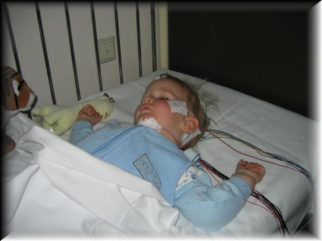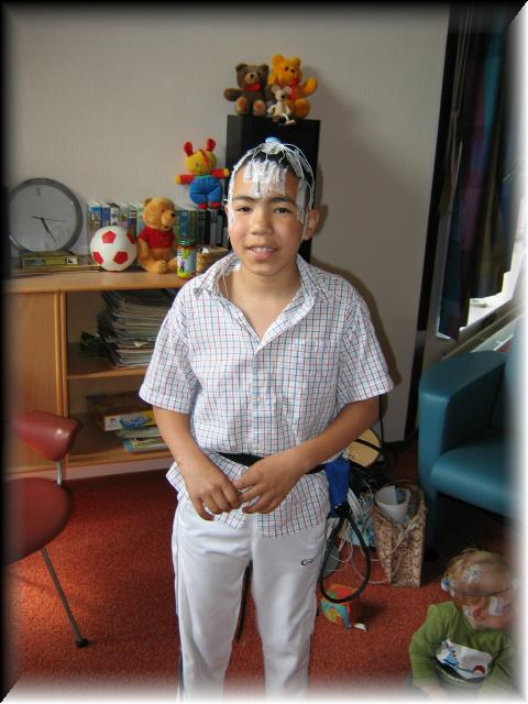 Op 9 juni ben ik (Yvonne) met Danny naar Zwolle afgereisd voor het slaaponderzoek in het kader van de groeistichting. Het was allemaal heel spannend. Ten eerste ging ik alleen met Danny en je weet absoluut niet wat je te wachten staat. Ik moest er om 15.00 uur zijn en was ruim op tijd aanwezig. Toen ik binnenkwam werd ik ontvangen door een van de begeleiders en werd er een kopje koffie aangeboden. We zaten in een huiskamer met nog 3 andere patiënten die voor een bepaald onderzoek kwamen. Die andere 3 patienten, 1 meisje die 1 maand ouder was als Danny, een jongen van 10 en een meisje van 19, kwamen allemaal voor onderzoek naar epilepsie en die waren dus de hele dag daar al aanwezig. Het meisje van 19 was daar zelfs al 3 weken ter observatie opgenomen. En ja, dan zit je daar en is alles even heel confronterend. Je zit namelijk niet in een gewone huiskamer maar in een huiskamer vol met apparatuur, videocamera's, microfoons, monitoren, computers en lange snoeren. Patiënten die voor epilepsie onderzoek komen hebben hun hoofd vol draadjes en deze draadjes zijn aangesloten via een lange kabel op een computer en ze worden ook constant gefilmd en met de microfoon opgenomen. Dus waar je ook zit en wat je ook doet je wordt constant gefilmd. Even wennen dus...