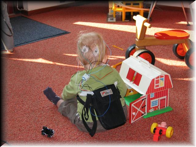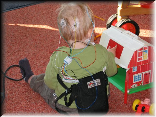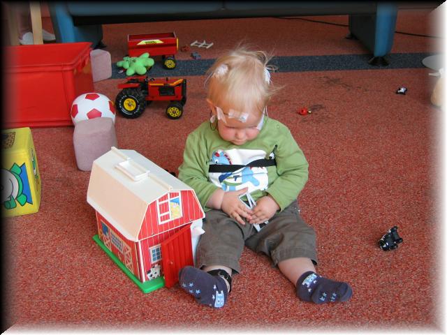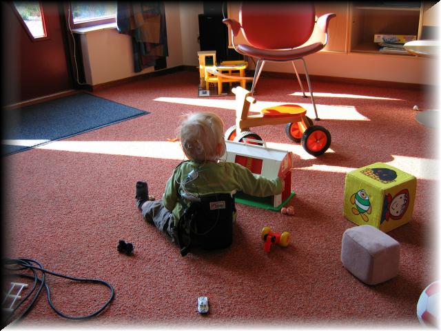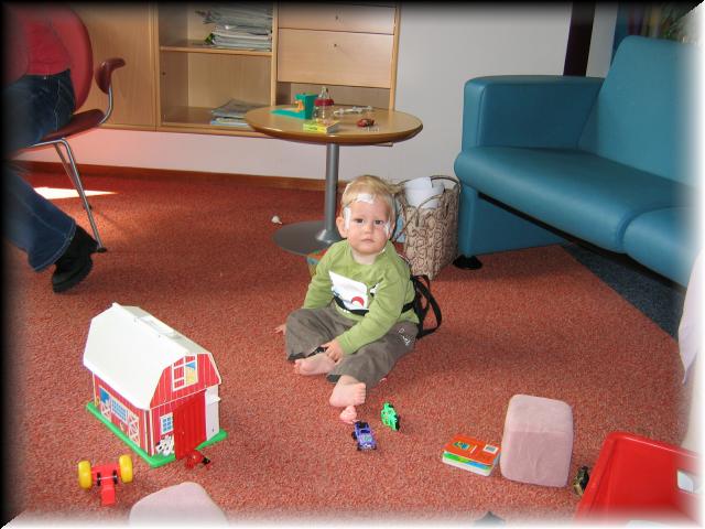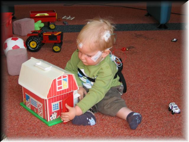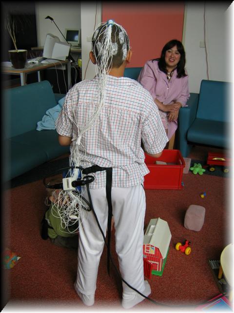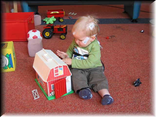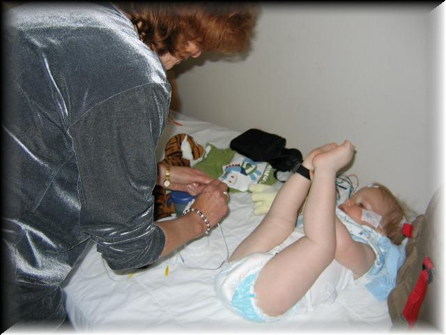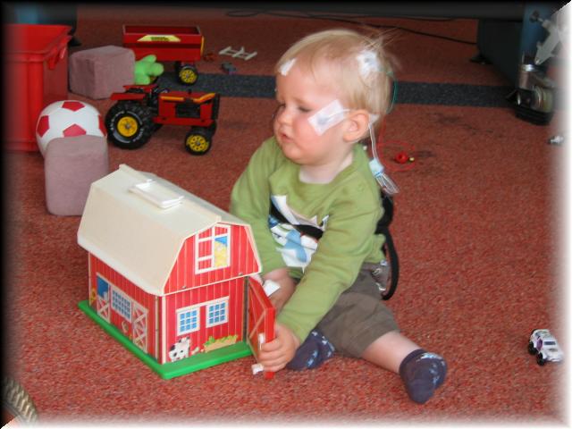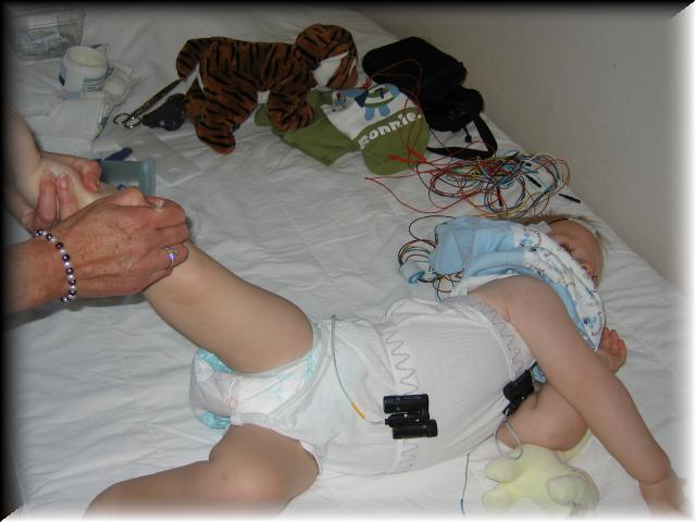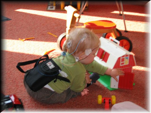 Op 9 juni ben ik (Yvonne) met Danny naar Zwolle afgereisd voor het slaaponderzoek in het kader van de groeistichting. Het was allemaal heel spannend. Ten eerste ging ik alleen met Danny en je weet absoluut niet wat je te wachten staat. Ik moest er om 15.00 uur zijn en was ruim op tijd aanwezig. Toen ik binnenkwam werd ik ontvangen door een van de begeleiders en werd er een kopje koffie aangeboden. We zaten in een huiskamer met nog 3 andere patiënten die voor een bepaald onderzoek kwamen. Die andere 3 patienten, 1 meisje die 1 maand ouder was als Danny, een jongen van 10 en een meisje van 19, kwamen allemaal voor onderzoek naar epilepsie en die waren dus de hele dag daar al aanwezig. Het meisje van 19 was daar zelfs al 3 weken ter observatie opgenomen. En ja, dan zit je daar en is alles even heel confronterend. Je zit namelijk niet in een gewone huiskamer maar in een huiskamer vol met apparatuur, videocamera's, microfoons, monitoren, computers en lange snoeren. Patiënten die voor epilepsie onderzoek komen hebben hun hoofd vol draadjes en deze draadjes zijn aangesloten via een lange kabel op een computer en ze worden ook constant gefilmd en met de microfoon opgenomen. Dus waar je ook zit en wat je ook doet je wordt constant gefilmd. Even wennen dus...