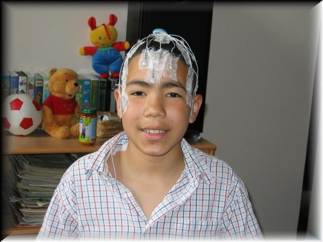 Na de koffie krijgt Danny zijn eerste 7 draadjes op zijn hoofd. Dit na een heel gevecht want onze kleine kanjer vond dat maar helemaal niks. Toen ze eenmaal vastzaten op zijn hoofd bleef hij er gelukkig wel aardig goed vanaf.